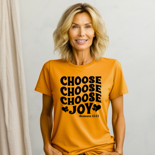 “Choose Joy” is a simple yet powerful declaration that radiates positivity, faith, and intentional living. It’s a reminder that no matter the season, circumstance, or struggle—joy is a choice, not just an emotion. This design speaks to the heart of the woman who wakes up and decides to find light, even in the dark.